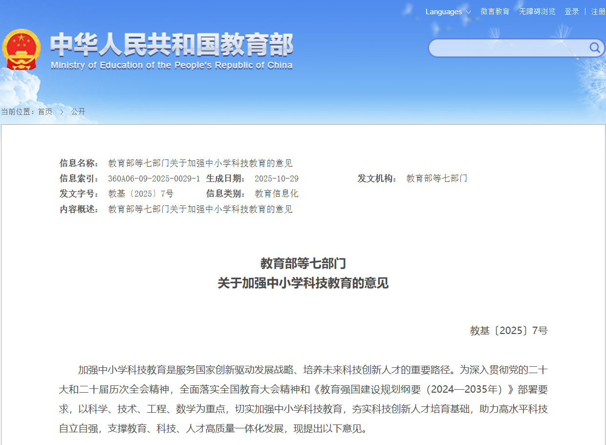 近日,教育部等七部门联合印发《关于加强中小学科技教育的意见》(以下简称《意见》),这份文件指向一个明确方向:我们的孩子需要从小培养科创兴趣,而这份兴趣可能比一时的分数更加重要。
