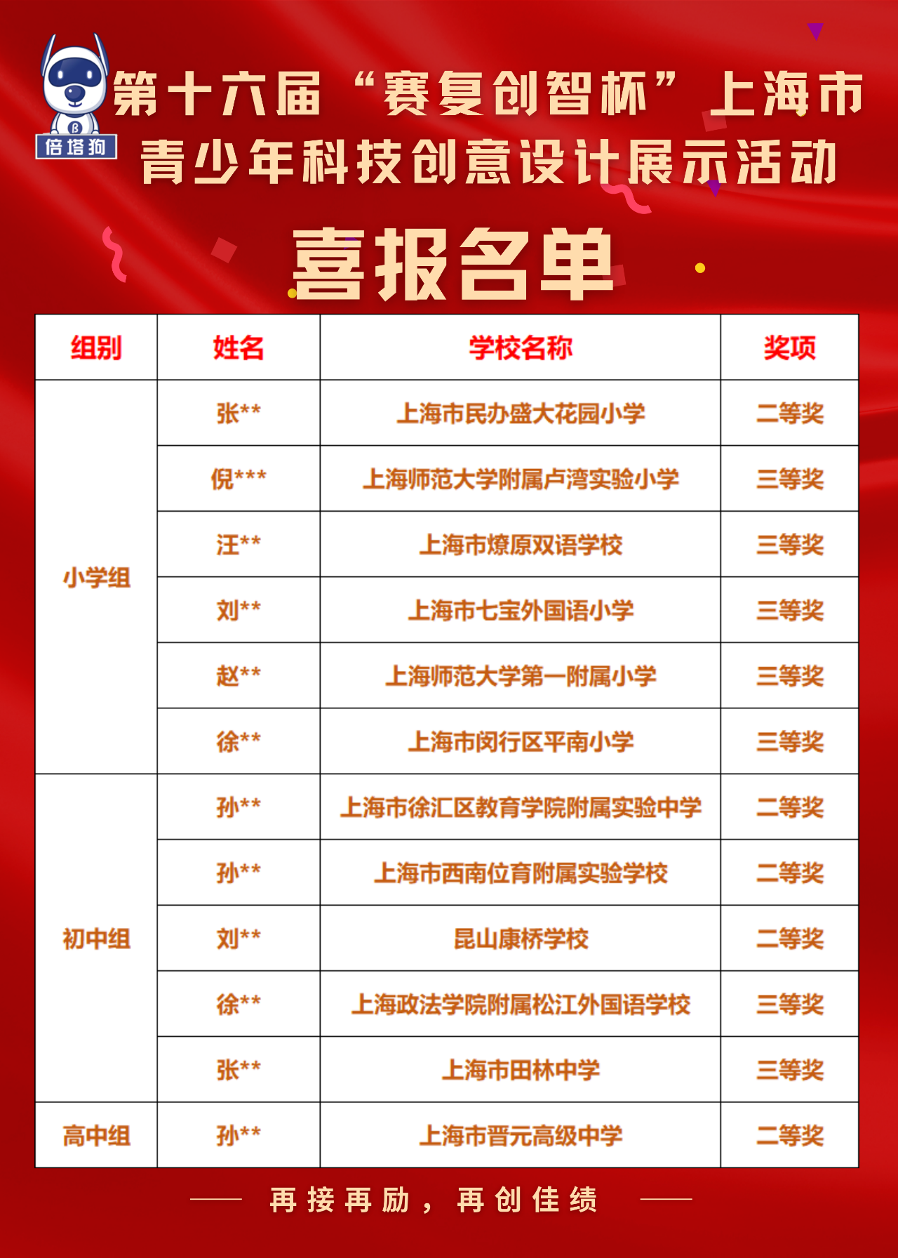 热烈祝贺倍塔狗学员在第十六届“赛复创智杯”上海市青少年科技创意设计展示活动中再创佳绩!倍塔狗的学员们,共有12人获得市级奖项!其中:二等奖5人,三等奖7人,让我们一起看一下是哪些同学获奖吧!