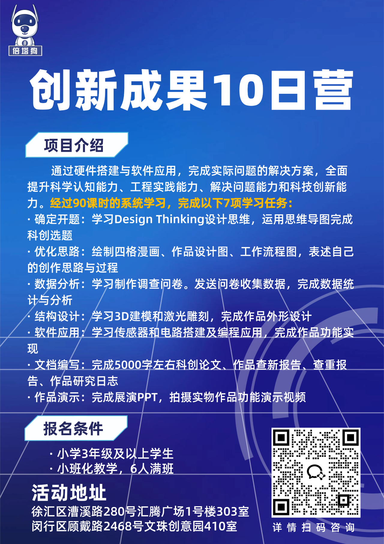 倍塔狗人工智能教育成立于2013 年,是一家培养青少年创新精神的人工智能教育机构。在上海交通大学及美国普林斯顿博士团队的带领下,基于前沿人工智能技术,综合考虑青少年的身心发展与认知能力,自主研发了独家课程体系:倍塔狗ALL3课程体系。涵盖七大跨学科课程板块:构造、电路、编程、智能、设计、整合、创新。