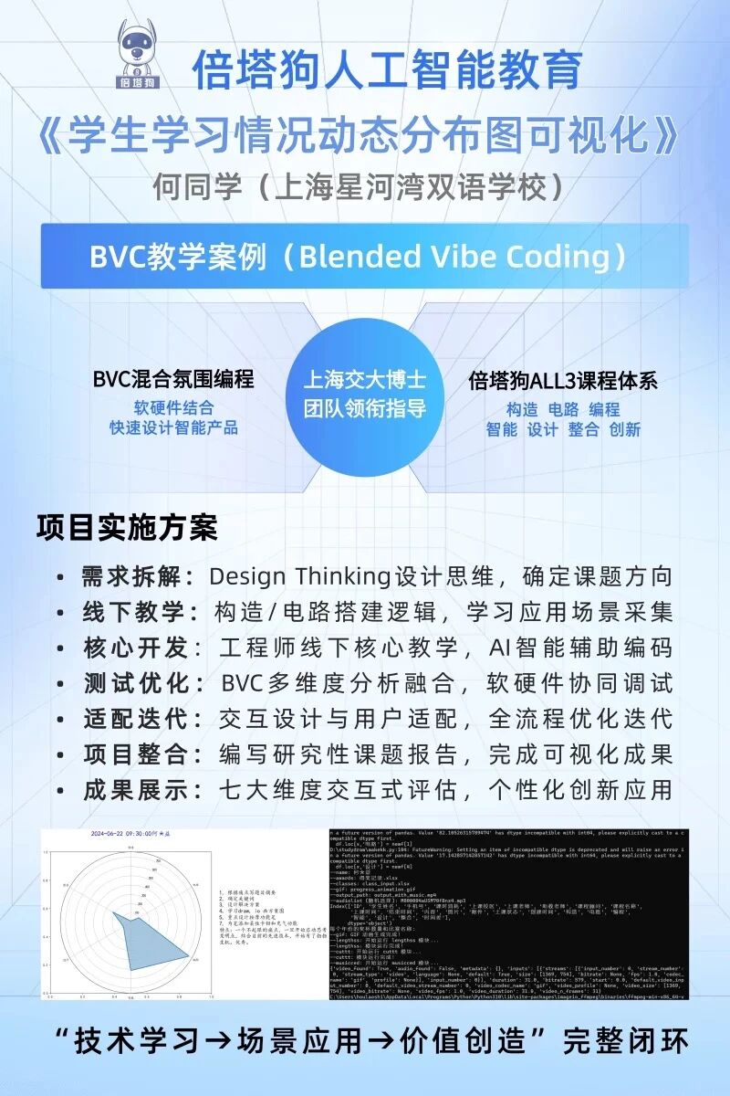 在大模型时代,倍塔狗提出了Blended Vibe Coding(BVC) 混合氛围编程理念,利用学生、工程师、硬件、软件、线上、线下、AI七大混合,帮助学生快速完成创新作品, 实现改变世界的梦想,人工智能赋能自主钻研,创客文化点亮创新精神。