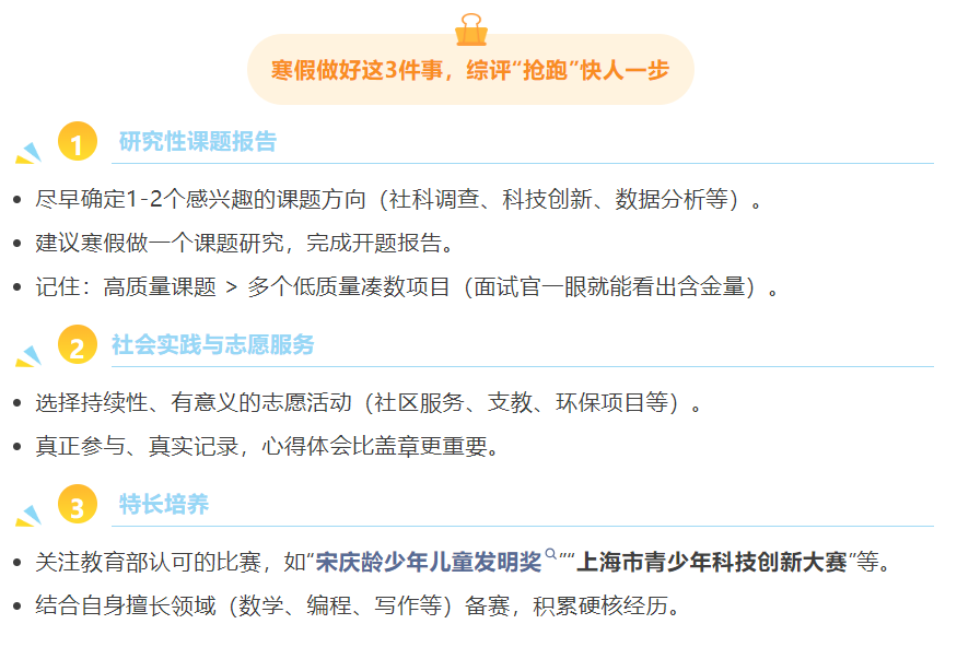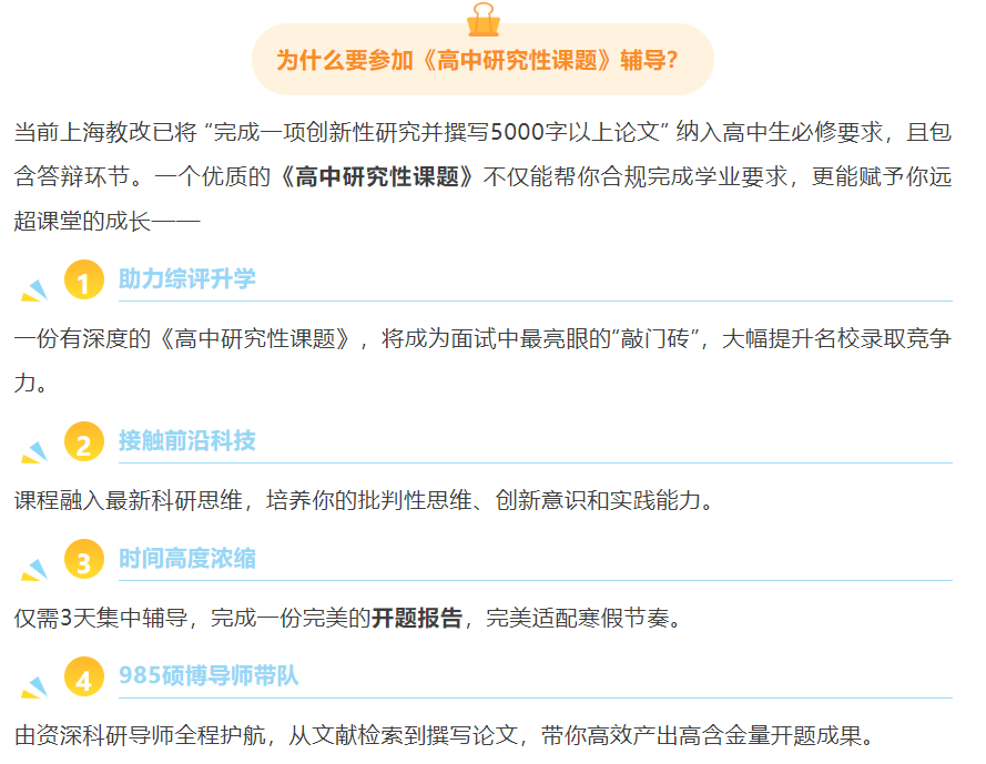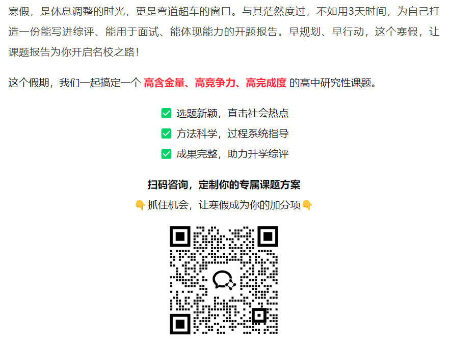 寒假不规划,开学差距大!越来越多的家长已经意识到:一份扎实、有亮点的《高中研究性课题》,不仅是综合素质评价里的“硬通货”,更可能成为孩子决胜高考综评、迈进名校的关键一步。