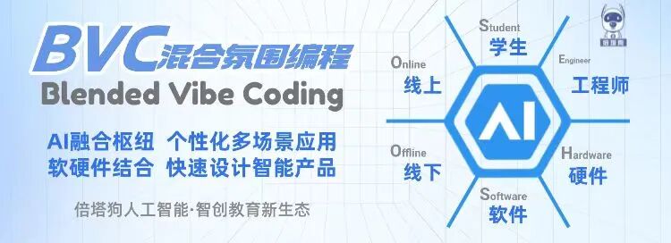 在大模型时代,倍塔狗提出了Blended Vibe Coding(BVC) 混合氛围编程理念,利用学生、工程师、硬件、软件、线上、线下、AI七大混合,帮助学生快速完成创新作品, 实现改变世界的梦想,人工智能赋能自主钻研,创客文化点亮创新精神。